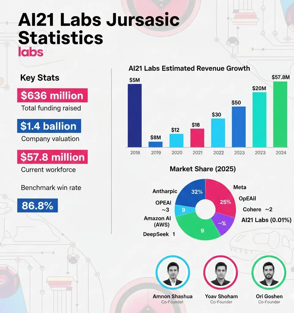 AI21 Labs competes with Anthropic (32% market share), OpenAI (25%), Google (20%), Meta Llama (9%), and Cohere in the enterprise LLM market. The company holds approximately 0.01% market share as of 2025.
