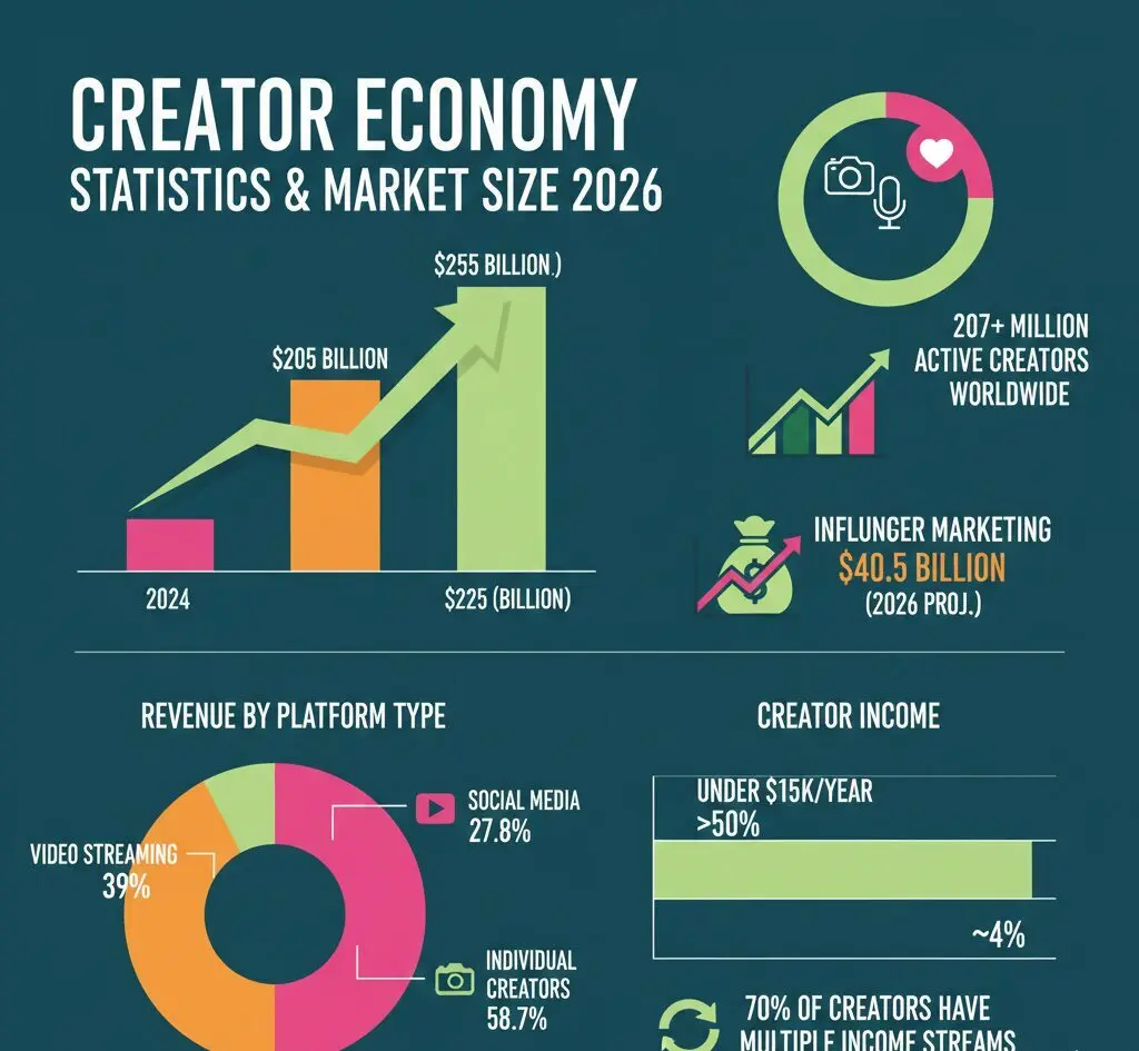 The creator economy reached $205 billion in 2024 and is projected to pass $250 billion in 2025. With over 207 million active creators worldwide and influencer marketing spend exceeding $32 billion this year, the space has outgrown its “side hustle” origins. This article covers verified data on creator economy market size, regional breakdowns, platform revenue, creator income, and influencer marketing spend through 2026.