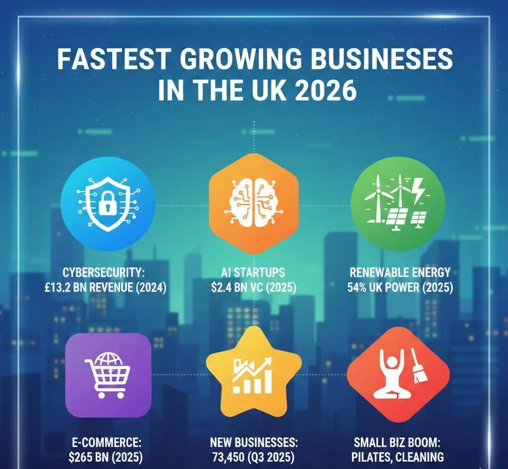 UK cybersecurity firms pulled in £13.2 billion in revenue during 2024, up 12% year on year. AI startups raised a record $2.4 billion in venture capital in the first half of 2025. Renewable electricity supplied over 54% of the national grid in Q3 2025. These numbers define the fastest growing business sectors in the UK heading into 2026, backed by government data, industry bodies, and market research firms.