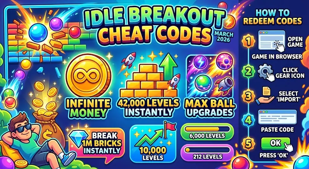 Idle Breakout codes are pre-built save files. When imported, they load a specific game state — giving you instant levels, maxed upgrades, or infinite money without playing through the content manually.