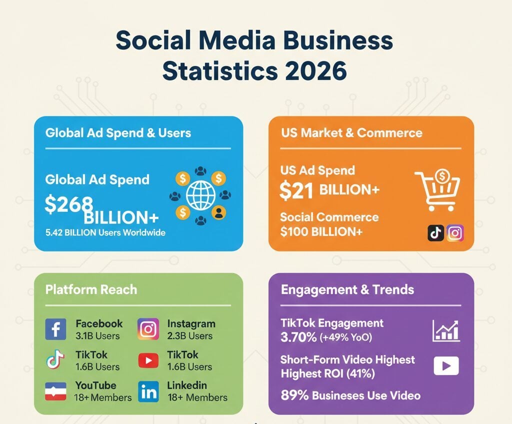 • Global social media ad spend is projected to reach $268 billion in 2026 (Statista).