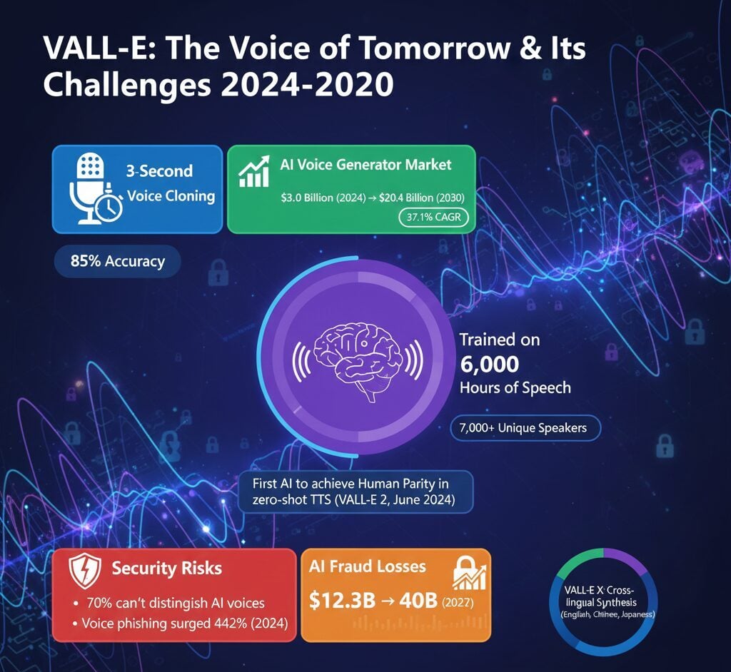 Microsoft’s VALL-E neural language model can clone any voice from just three seconds of audio, marking a significant advancement in text-to-speech synthesis. The system trained on 60,000 hours of English speech from over 7,000 unique speakers, representing a 100-fold increase over previous TTS models. In June 2024, Microsoft released VALL-E 2, which became the first AI voice system to achieve human parity in zero-shot text-to-speech synthesis. The broader AI voice generator market reached $3.0 billion in 2024 and is projected to grow to $20.4 billion by 2030.