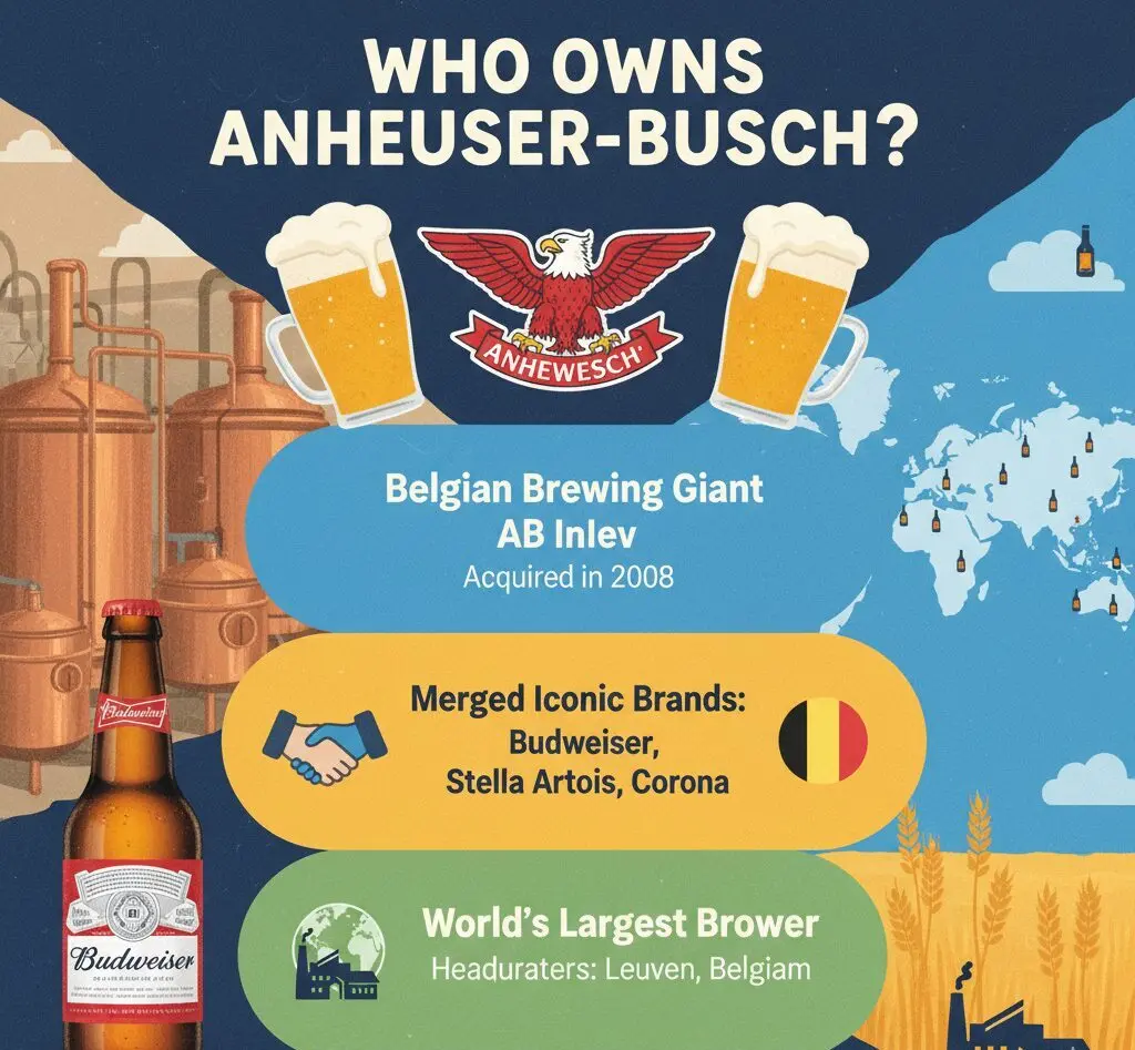 Belgian brewing giant AB InBev owns Anheuser-Busch following a landmark $52 billion acquisition in 2008. This merger created the world’s largest brewing company, bringing together iconic American brands like Budweiser with international powerhouses including Stella Artois and Corona.