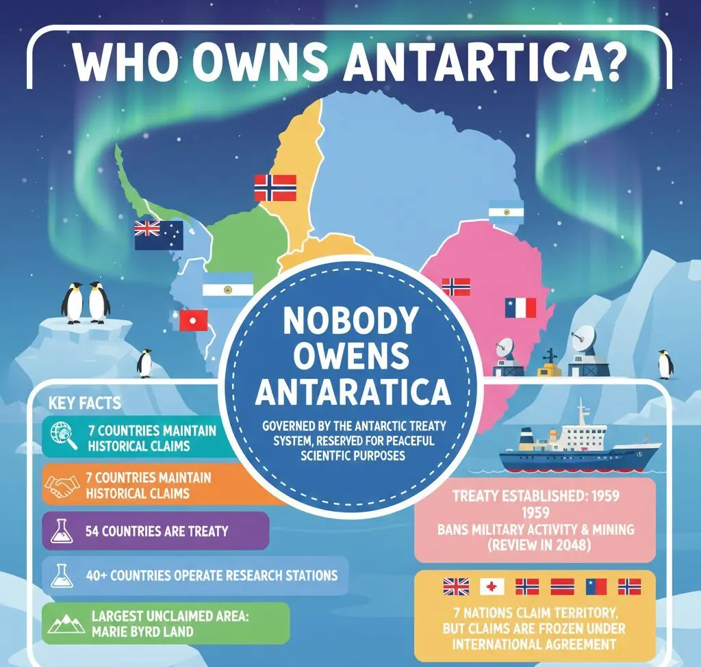 Nobody owns Antarctica. The continent operates under the Antarctic Treaty System, established in 1959, which reserves the territory for peaceful scientific purposes. While seven countries made historical territorial claims, these assertions remain frozen under international agreement.