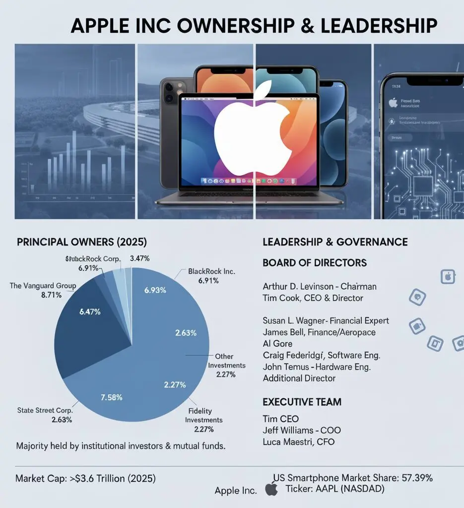Apple’s ownership structure consists primarily of institutional investors who collectively hold the majority of shares. No single entity controls Apple outright, as the company operates as a publicly traded corporation on the NASDAQ exchange under the ticker symbol AAPL.