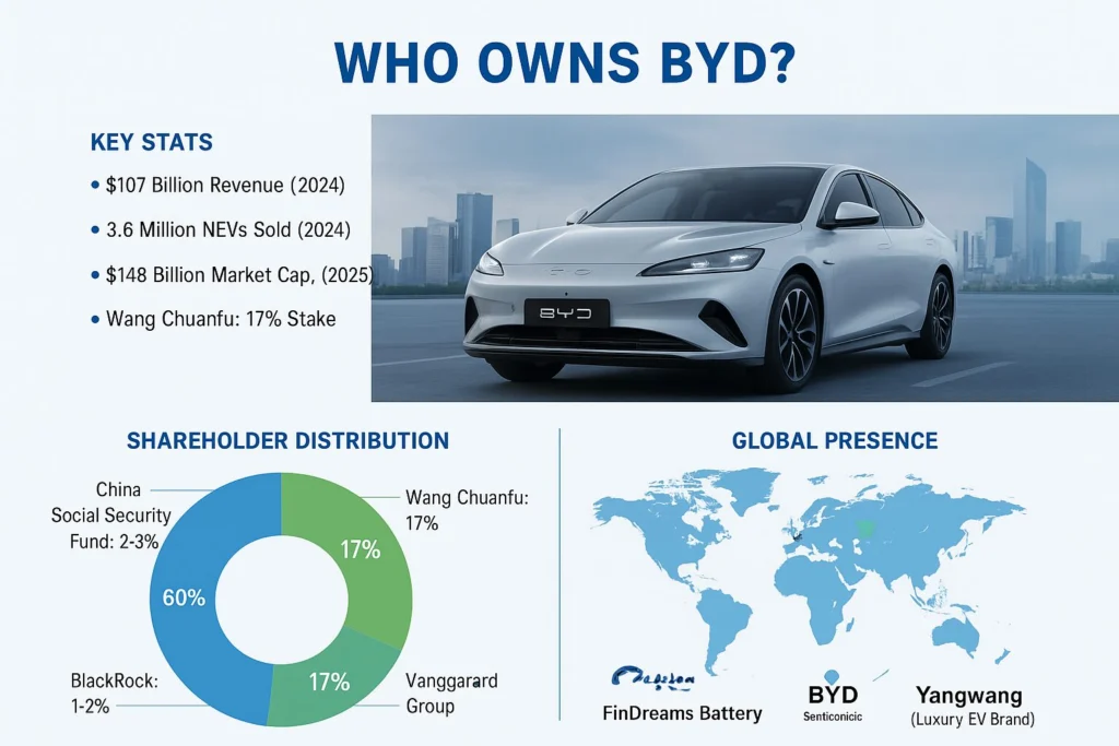 BYD operates as a publicly traded company with shares listed on both the Hong Kong Stock Exchange and the Shenzhen Stock Exchange. This dual listing structure creates diverse ownership across international and domestic Chinese investors. The ownership composition reflects a balance between founder control, institutional backing, and public participation.