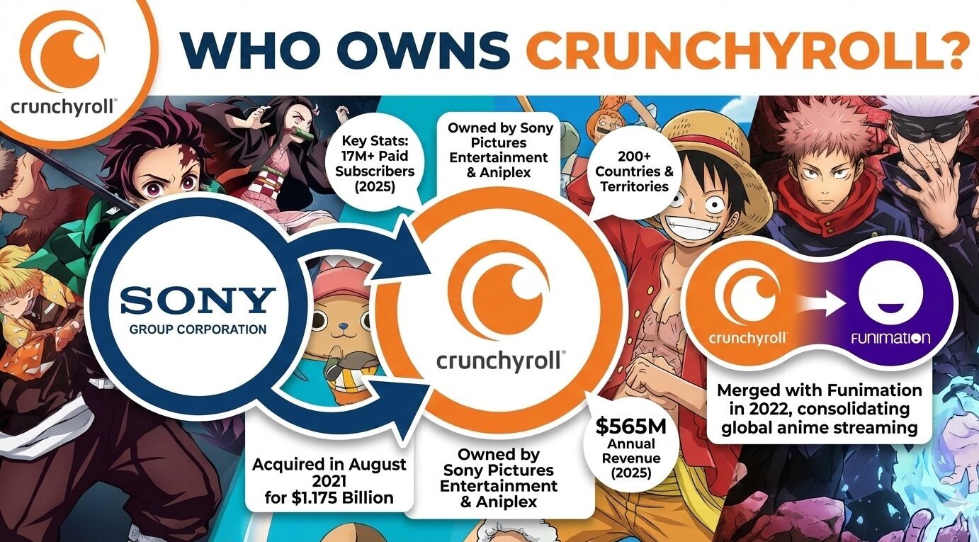 Sony Group Corporation owns Crunchyroll entirely, having acquired the platform from WarnerMedia in August 2021 for $1.175 billion. The Japanese conglomerate manages operations through Sony Pictures Entertainment and Aniplex, positioning itself as the dominant force in global anime distribution.