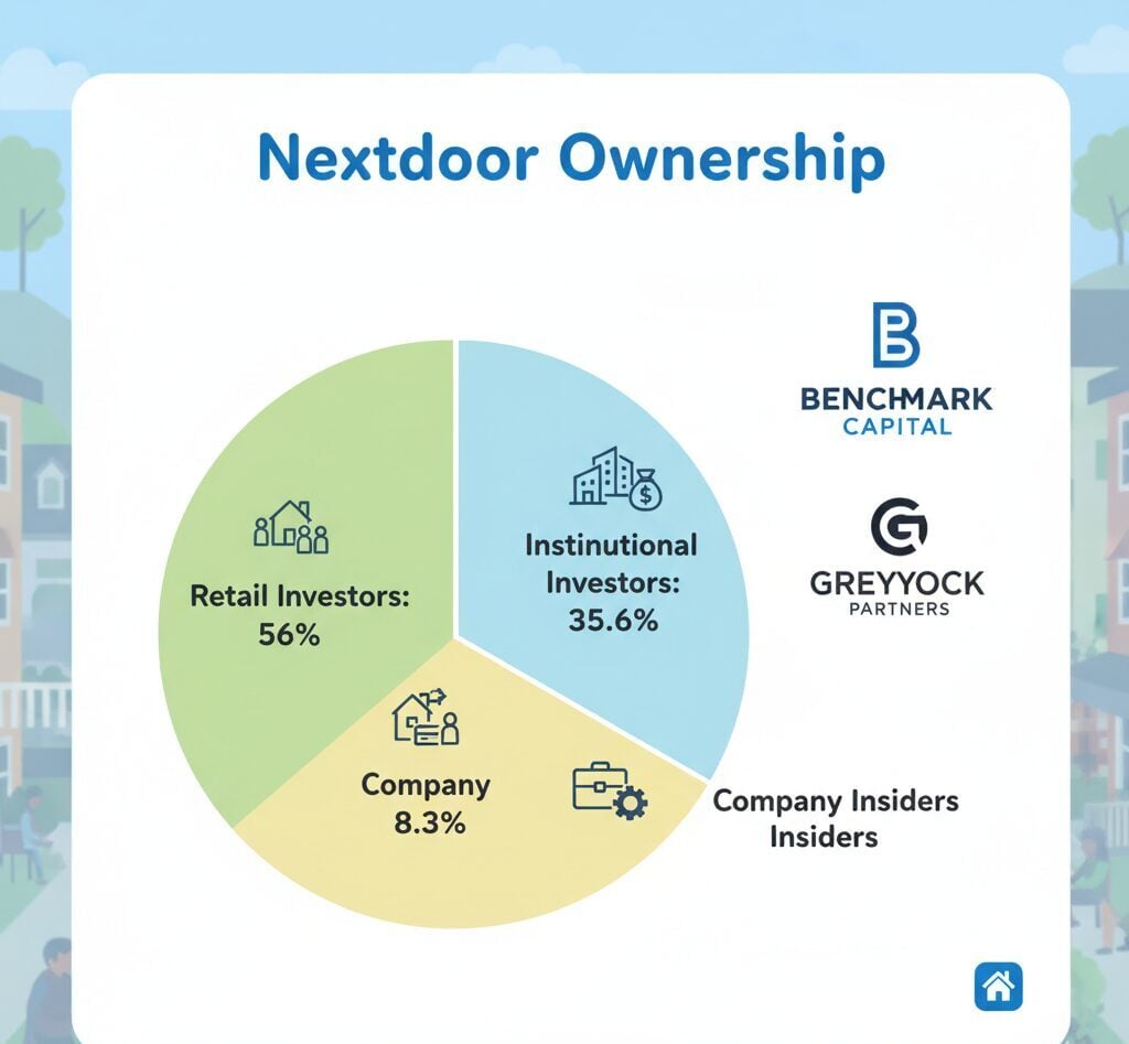 Nextdoor is publicly traded on NYSE under ticker KIND. Ownership is distributed among institutional investors holding 35.64%, retail investors with 56.03%, and company insiders owning 8.32% of outstanding shares.