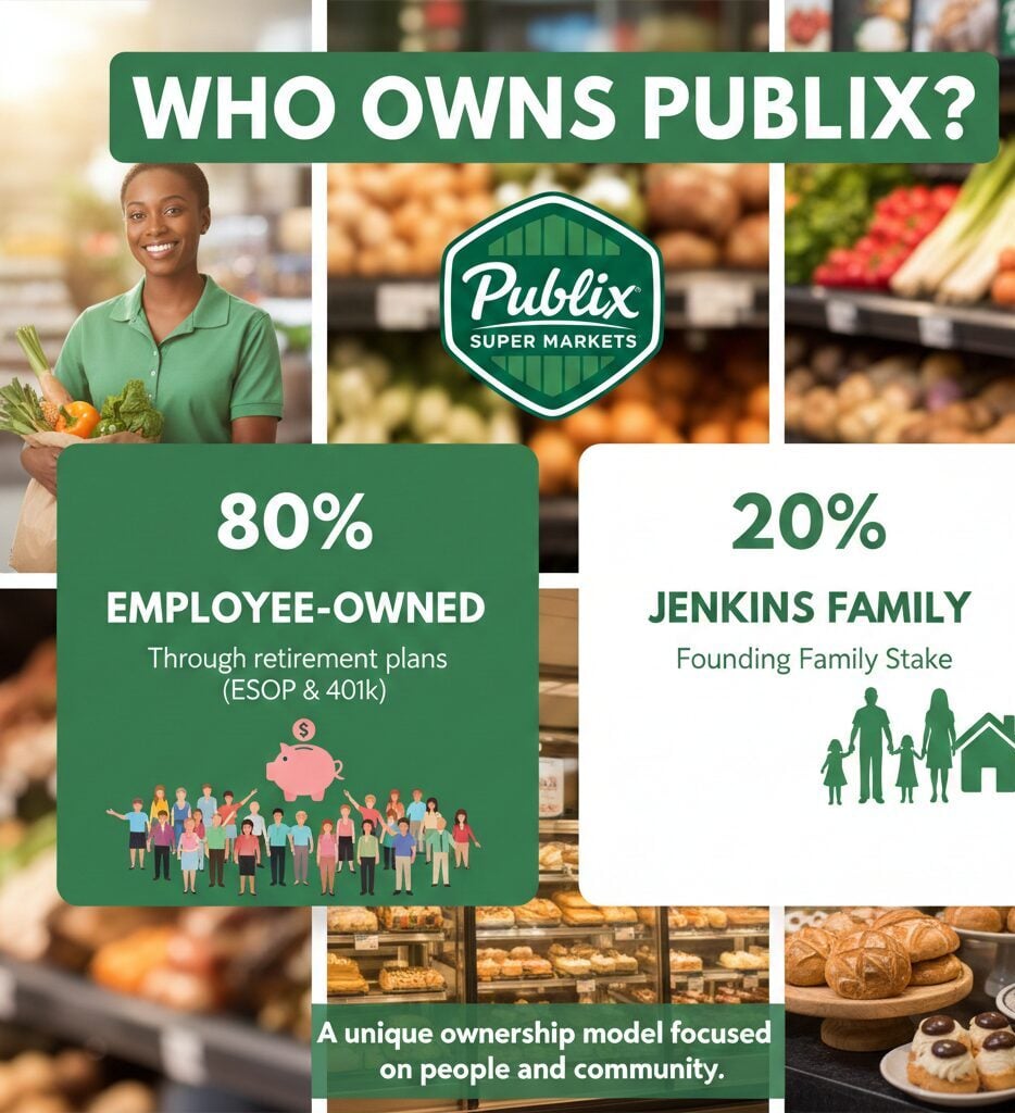 Employees own approximately 80% of Publix through ESOP and 401(k) plans. The founding Jenkins family retains the remaining 20% ownership stake.
