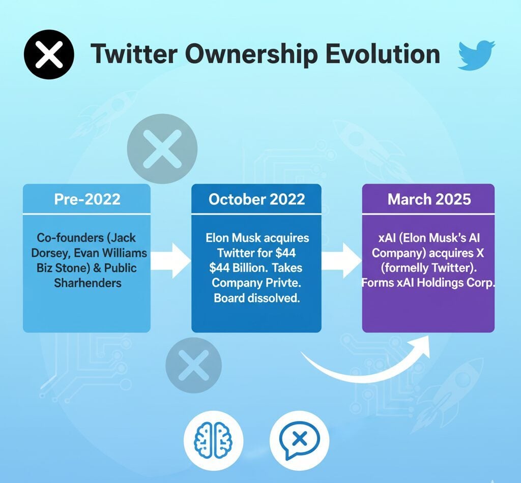 The ownership structure of Twitter dramatically shifted when xAI completed its acquisition in March 2025. The deal combined two Musk-controlled entities through an all-stock transaction that valued X at $33 billion while xAI received an $80 billion valuation.